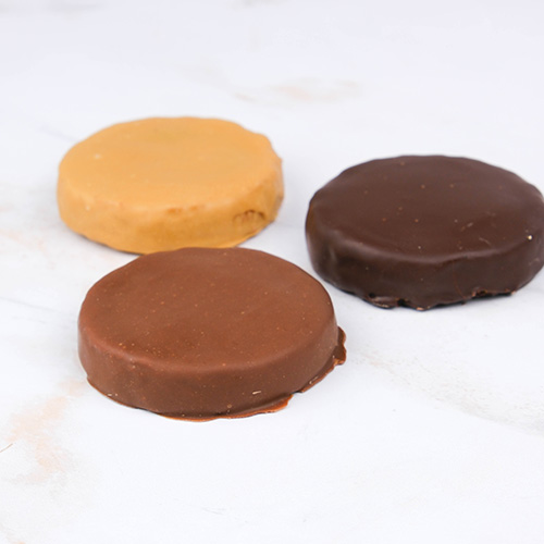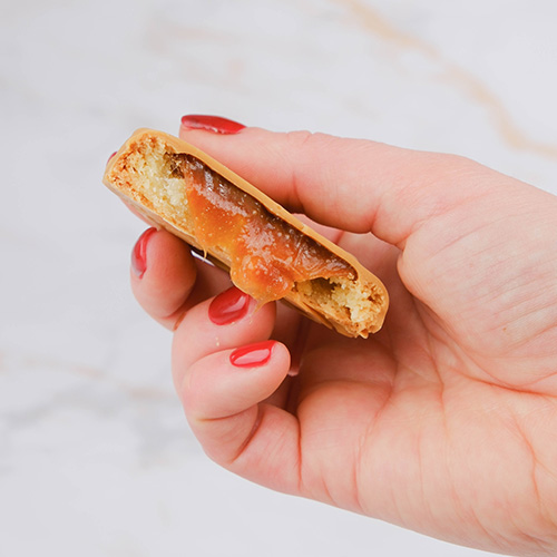 Chaque sablé commence par une base pur beurre croustillante, cuite juste comme il faut, pour laisser place à un cœur fondant ultra généreux, puis un enrobage complet de chocolat Valrhona, travaillé à la main.