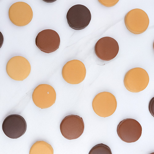 Caramel onctueux enrobé de chocolat blond 35 % (Dulcey) → doux, lacté, velouté