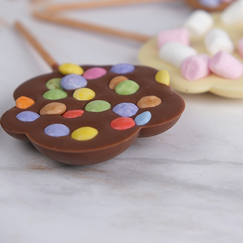 Colorée, gourmande et entièrement fabriquée à la main dans notre laboratoire, la Sucette Nuage est une invitation à la joie chocolatée.